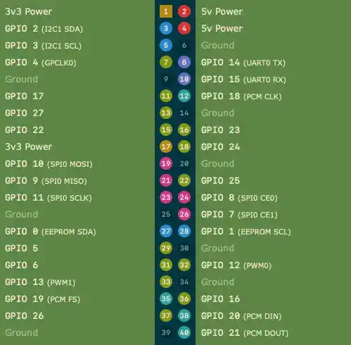 | Use | GPIO | Note ||-----------------|-----------|----------|| ViN | 5V Power | 5V || BCLK | GPIO18 | PCM CLK || LRC | GPIO19 | PCM FS || DIN | GPIO21 | PCM DOUT || SD | GPIO12 | Shutdown || GND | GND | |